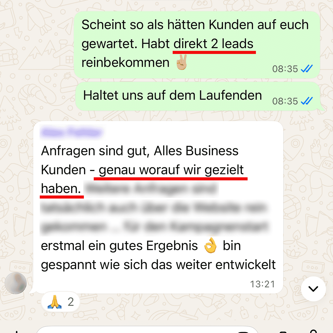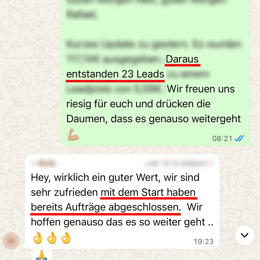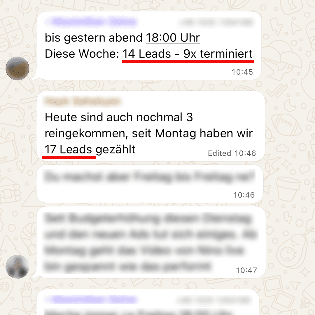 Seit der Zusammenarbeit erhalten wir täglich exklusive Kundenanfragen über unsere Webseite und Social-Media-Werbekampagnen. Die Terminierungsquote liegt dabei bei bis zu 87,5%.ˮ